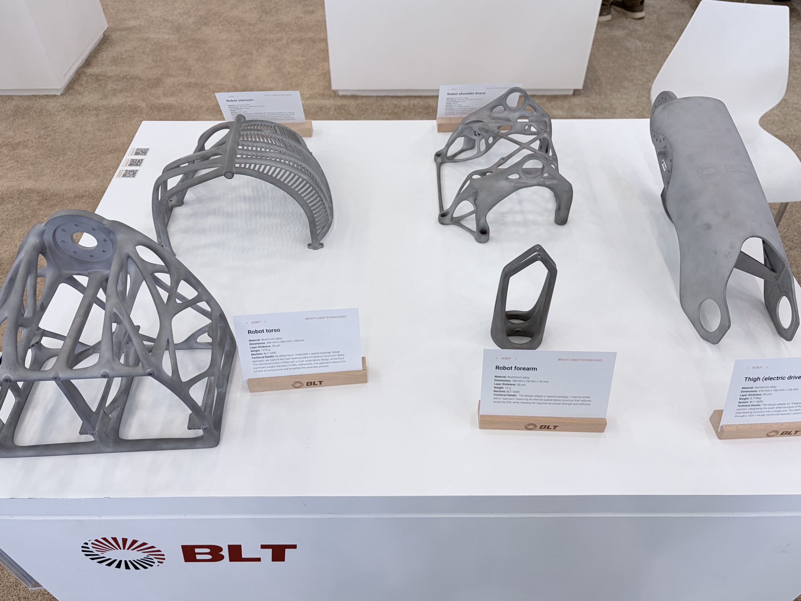 铂力特在现场展示了面向人形机器人行业的端到端增材制造解决方案,覆盖从大型结构件到高精度组件的规模化生产需求。通过铂力特的金属增材制造解决方案可实现零件的一体成形,在保证强度的前提下实现结构优化,有效减轻重量,有助于提升人形机器人的运动灵活性与能效表现。